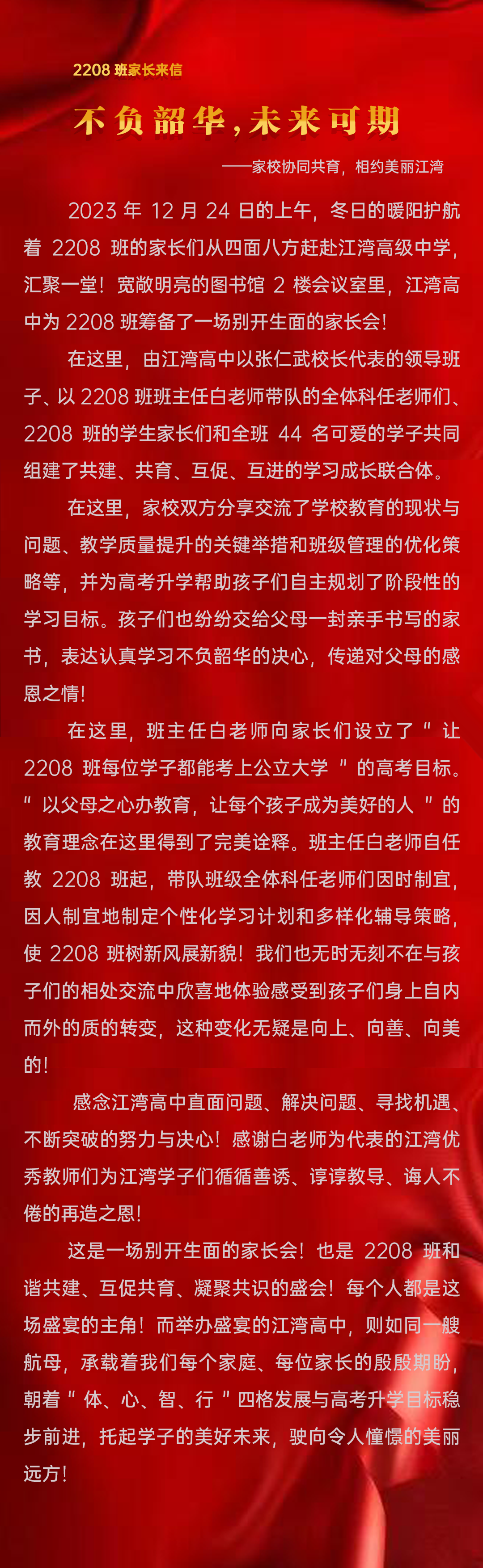 交流會現(xiàn)場,2208班的同學們還向各自的爸爸媽媽遞交了一封“家書”。家長們通過閱讀孩子們親手書寫的家書,聆聽到了孩子的心聲,打開孩子的內(nèi)心世界,有的臉上洋溢著幸福的笑容,有的眼眶里擎滿了感動的淚水。也許在看到孩子們的成長與進步,對他們又有了新的認識。千辛萬苦、千言萬語,都化作了一句“值得”。